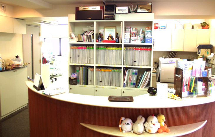 こちらで診察の受付、様々な掲示、使いやすい歯磨きのご案内、次回のご予約等を行っております。 また、ウォーターサーバーを設置しておりますので、 どうぞご自由にお飲みください。 |